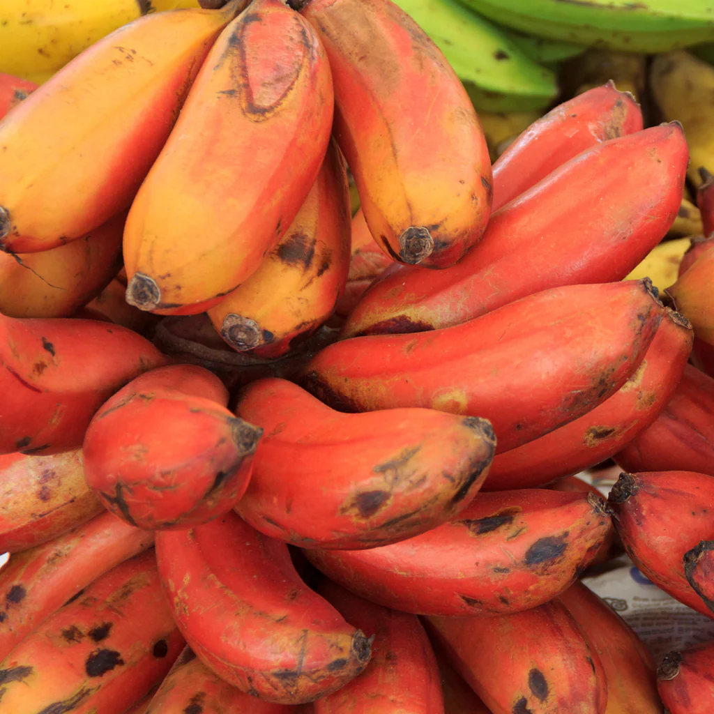 Red bananas offer deeper sweetness and creamier texture than common yellow varieties. Their reddish-purple skin and soft pale flesh make them a standout tropical fruit.
