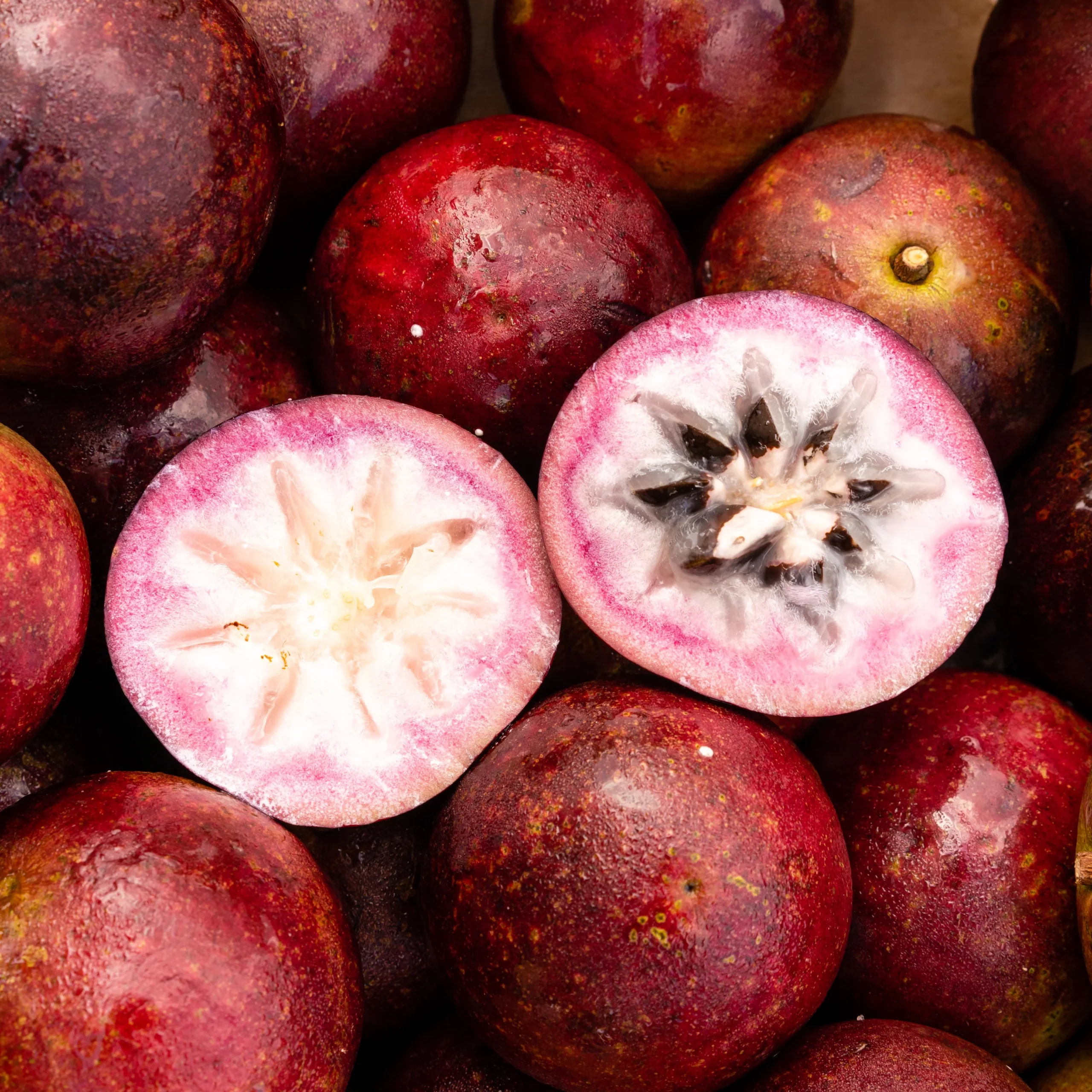 Star Apple, also called Caimito, is a round tropical fruit with glossy purple or green skin. When sliced, the flesh forms a natural star pattern. The pulp tastes sweet and silky with gentle tropical notes. The skin stays firm while the inside softens as it ripens.